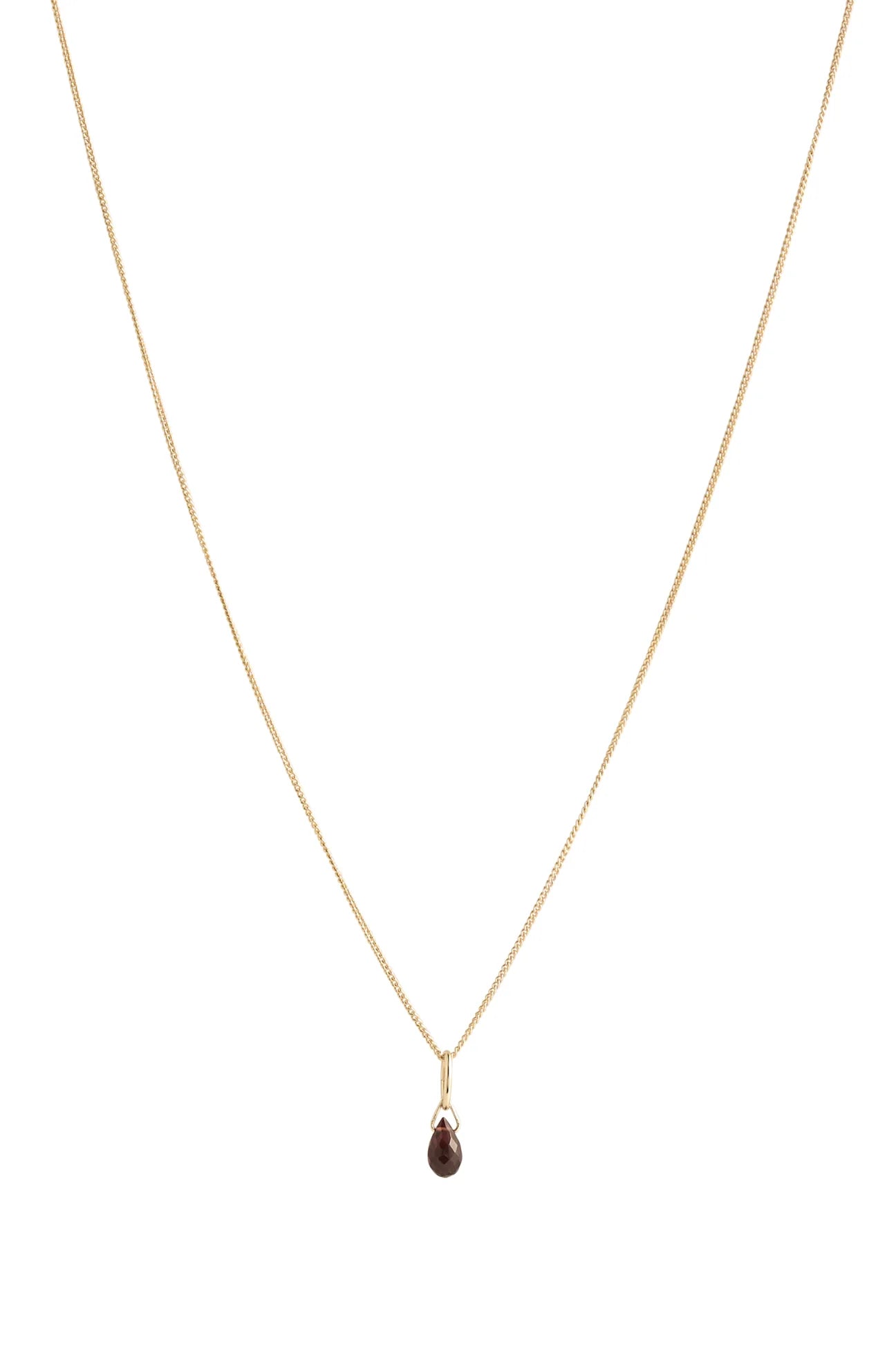 The Sila necklace features a petite Garnet faceted drop, secured by a 14K Gold bail, hanging from a delicate curb chain made of 14K Gold Fill.