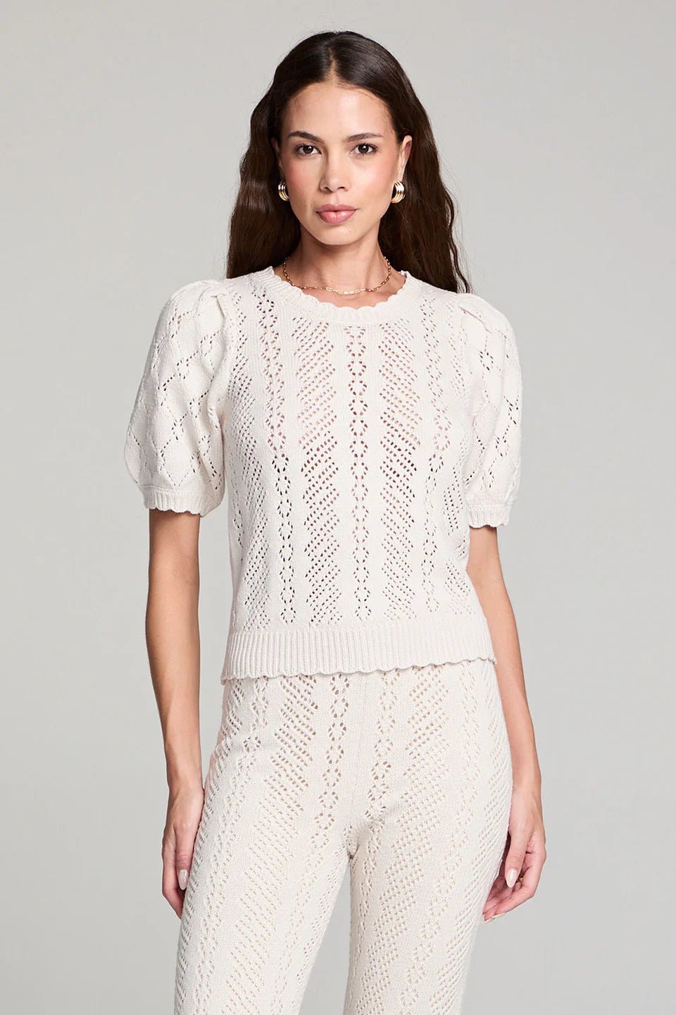 With scalloped edges and puffed sleeves, the Adara sweater is all romance. The subtle geometric print pairs perfectly with the soft creamy white fabric.