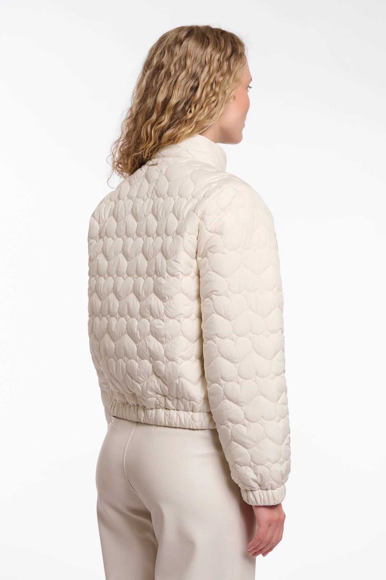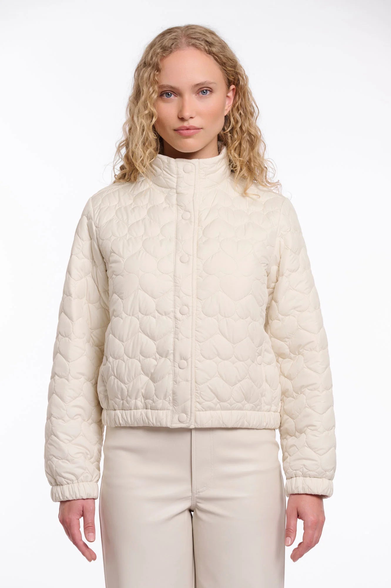 Wrap yourself in understated elegance with this lightly padded jacket, designed in a refined silhouette with delicate quilted detailing. The smooth finish and heart-shaped stitching add a subtle feminine touch, while the elasticated hem and cuffs keep the wind out for extra comfort. Finished with a sleek button closure, it’s the perfect layer to elevate your everyday look.