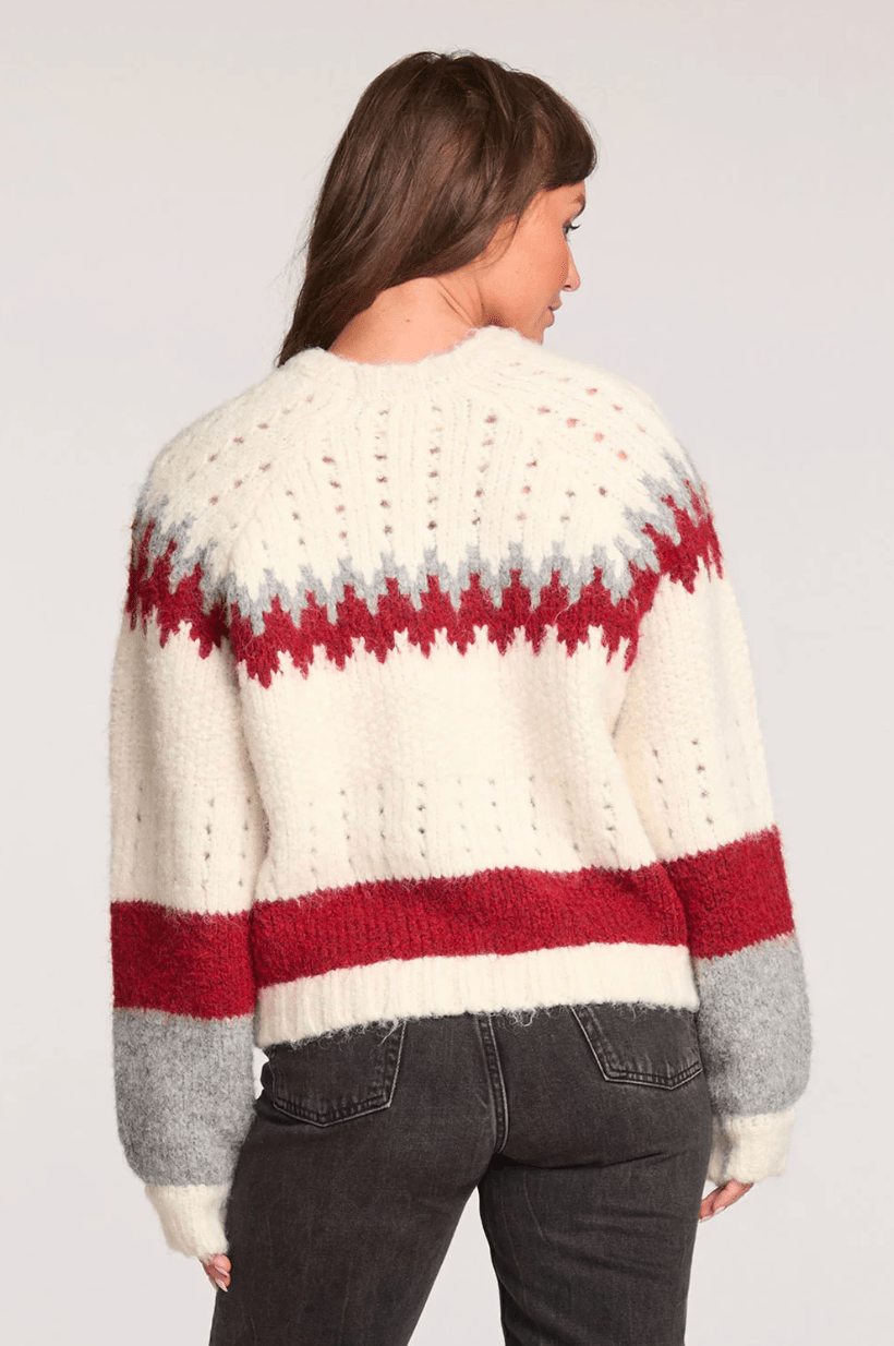 Inspired by Nordic knitwear, the Revel Sweater features a striking crimson pattern contrasted with elegant grey and white hues.