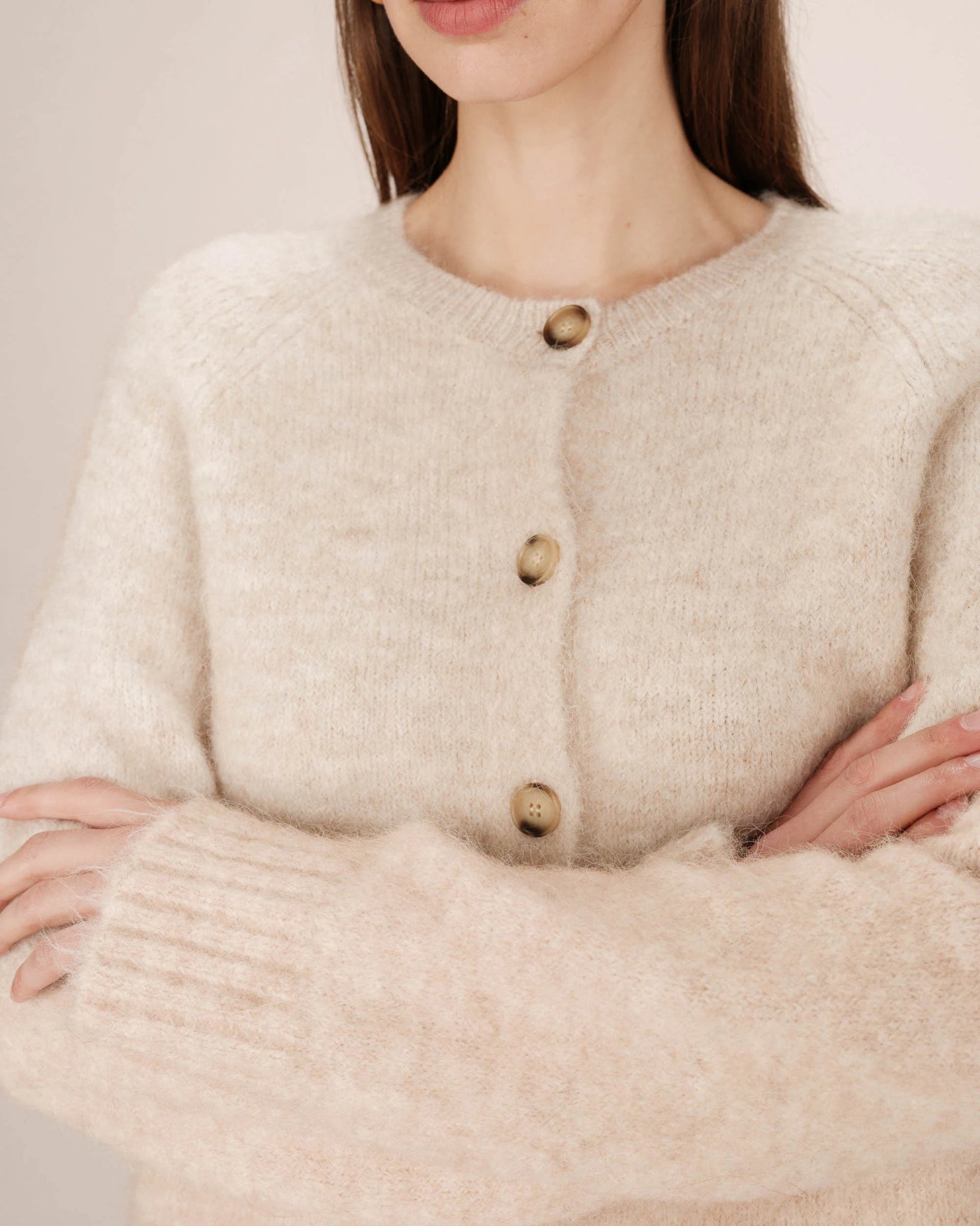 Knitted in a blend of wool and alpaca yarn, this buttoned cardigan is a soft and comfortable piece. Its straight cut and raglan sleeves create a relaxed silhouette, while the ribbed finishes give it structure.