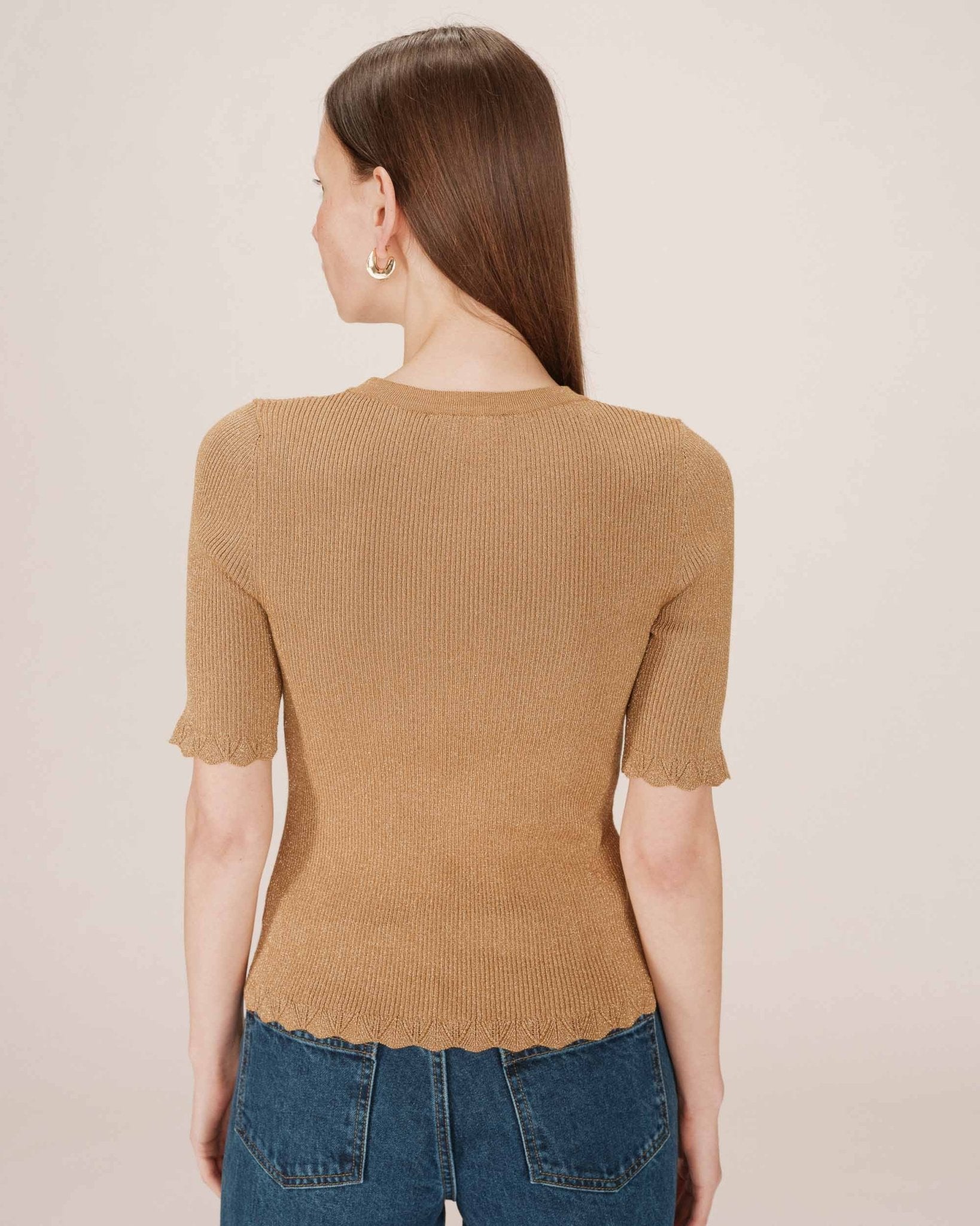 The Saturne fine knit sweater has a ribbed knit and slim fit offering a second-skin effect that flatters the feminine silhouette. Details such as the tubular crew neckline and the decorative finishes on the sleeve hems and bottom edge make the this short-sleeved sweater a refined and well-crafted piece.