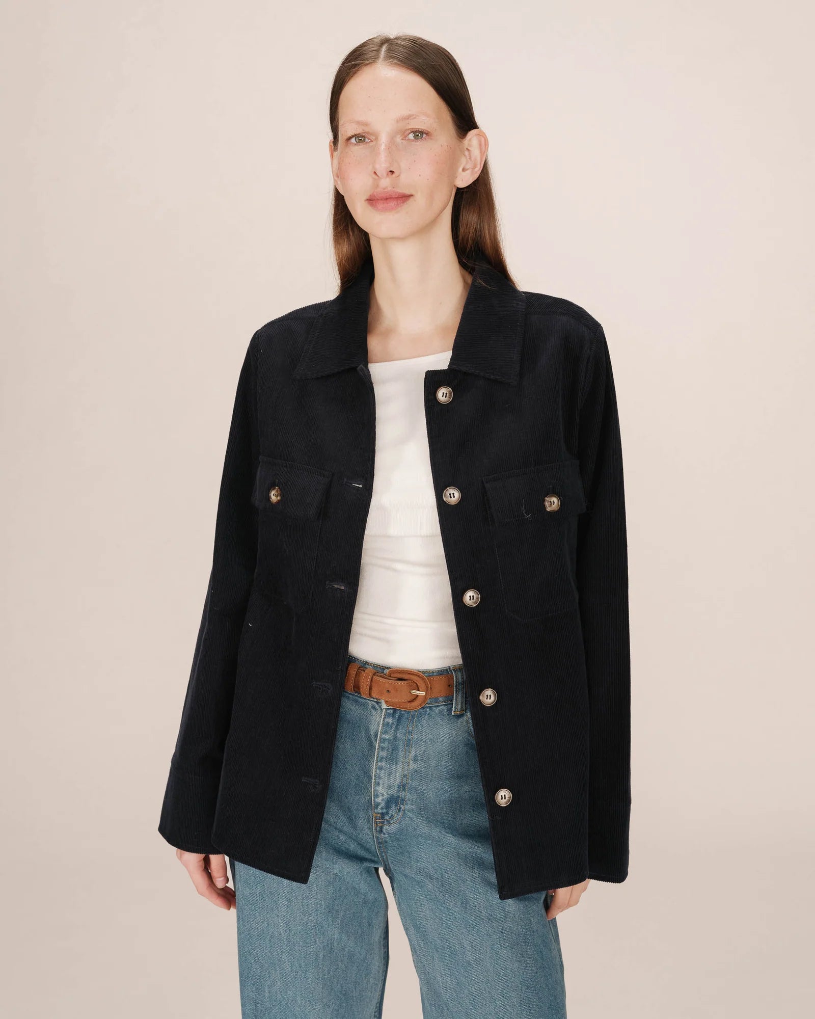 The SPECIAL straight shirt is made from corduroy fabric that adds a retro touch to the design. Its straight cut and flap patch pockets highlight a casual, utility-inspired look. The horn-effect buttons engraved with Grace & Mila on the SPECIAL corduroy shirt offer a refined and exclusive detail. This piece features long sleeves with buttoned cuffs and a classic shirt collar for a timeless silhouette.